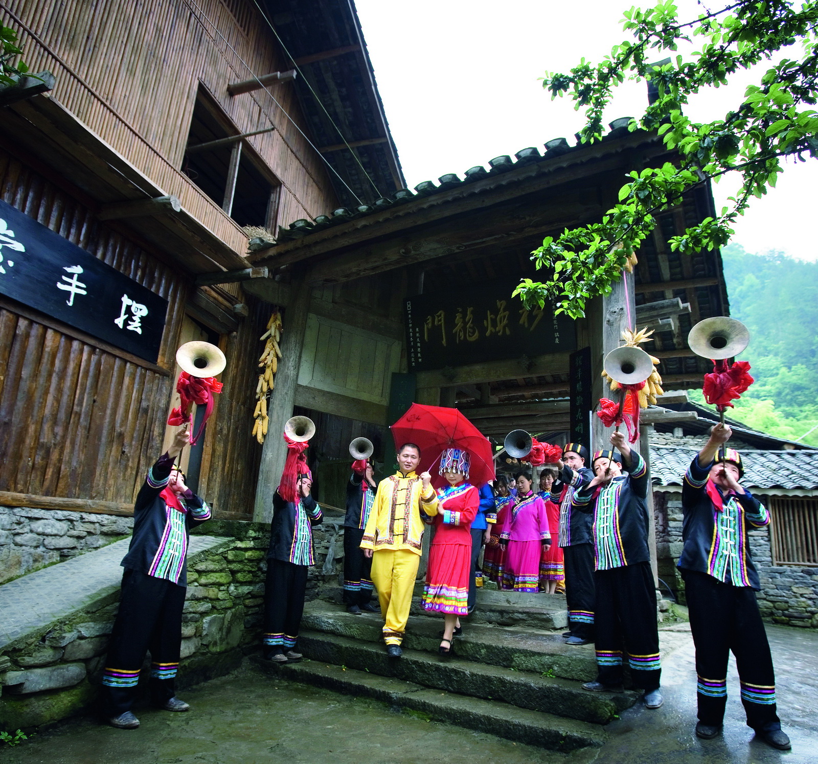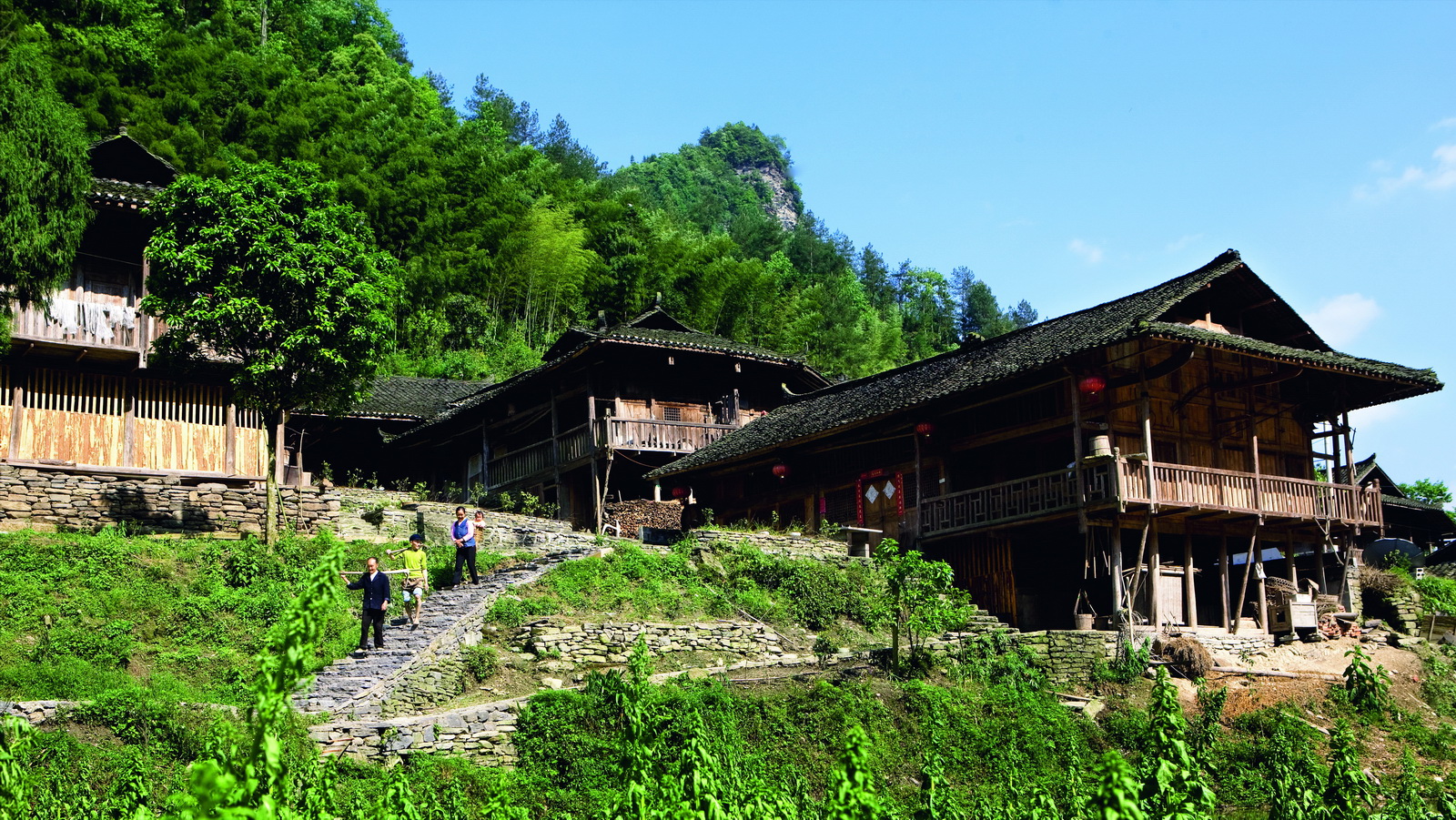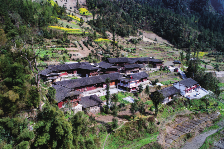 現(xiàn)有民居 5 棟,11 戶,30 余人,主要姓氏為張姓,主體民族為漢族。龍須寨因山梁走向似龍形而得名,原為龍姓苗民世居之地,現(xiàn)多為張姓人家。房柱、房梁用了多根楠木,中堂還供有一清代神祖牌。在龍須寨主民居的大門上方有一牌匾,上刻“瑞映金童”,是張氏祖先張漢松在清咸豐九年生子后,整竹米酒時受親友所贈。此處還有 3 棵相互依附的風(fēng)水古樹,分別是酸棗、巖柏和紅豆杉,被當(dāng)?shù)鼐用癞?dāng)神一樣敬奉。這也預(yù)示板夾溪以土家族、苗族、漢族三大民族和諧共生。