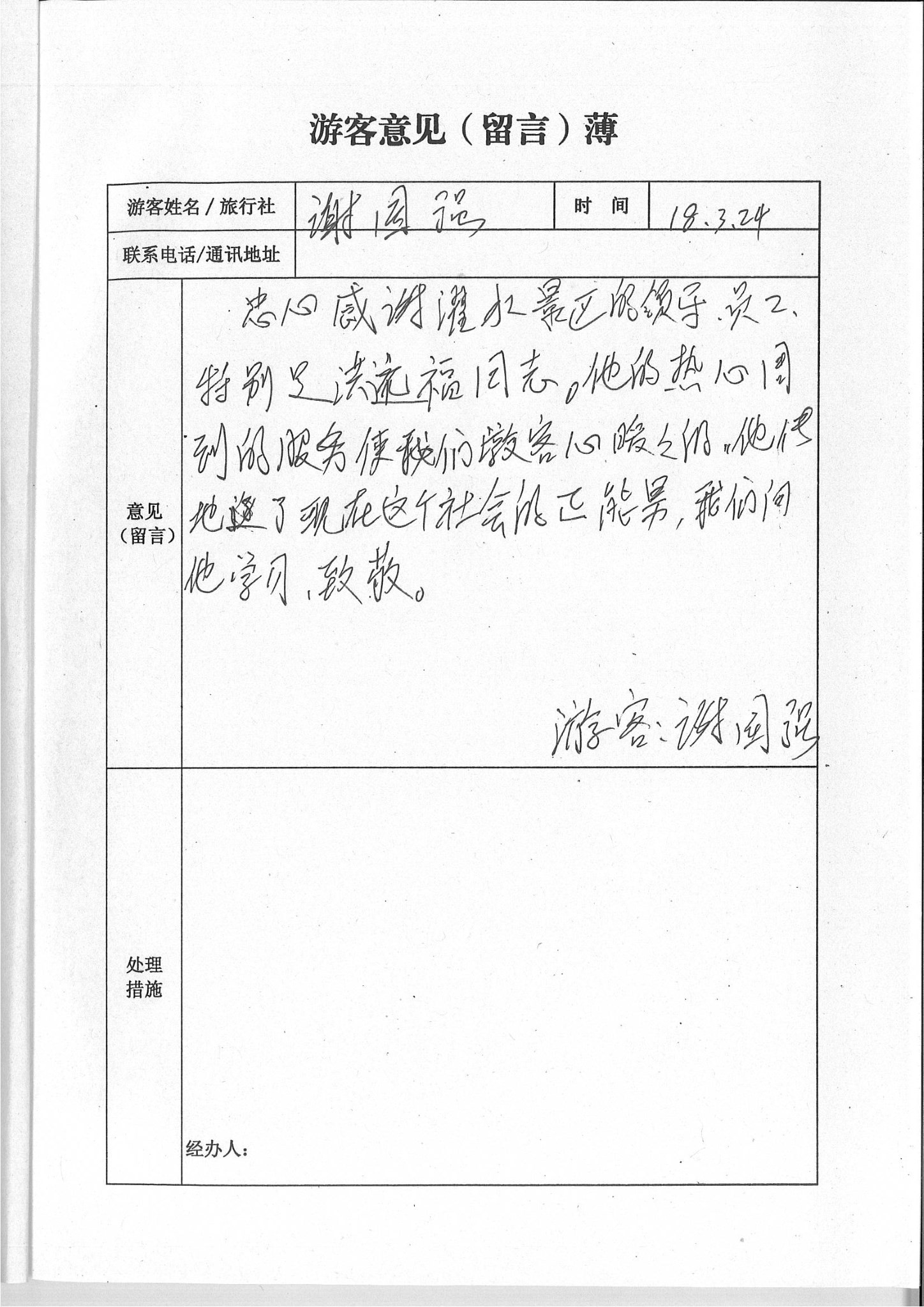 事情起源于2018年3月24日,來自河南平頂山風光旅行社的旅行團,有一名游客流鼻血不止,嘗試了多種辦法,均沒有效,路過濯水景區,導游帶生病的游客看病,受到濯水景區醫護人員和工作人員的熱心照顧,很快止住病情。特此,旅行團的導游和游客寫下了真情滿滿的感謝信,感謝濯水景區的熱心服務,對這種暖心服務點贊和鼓勵。