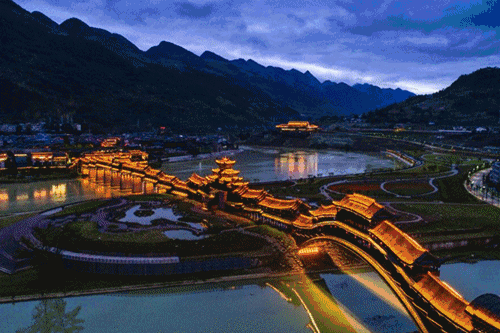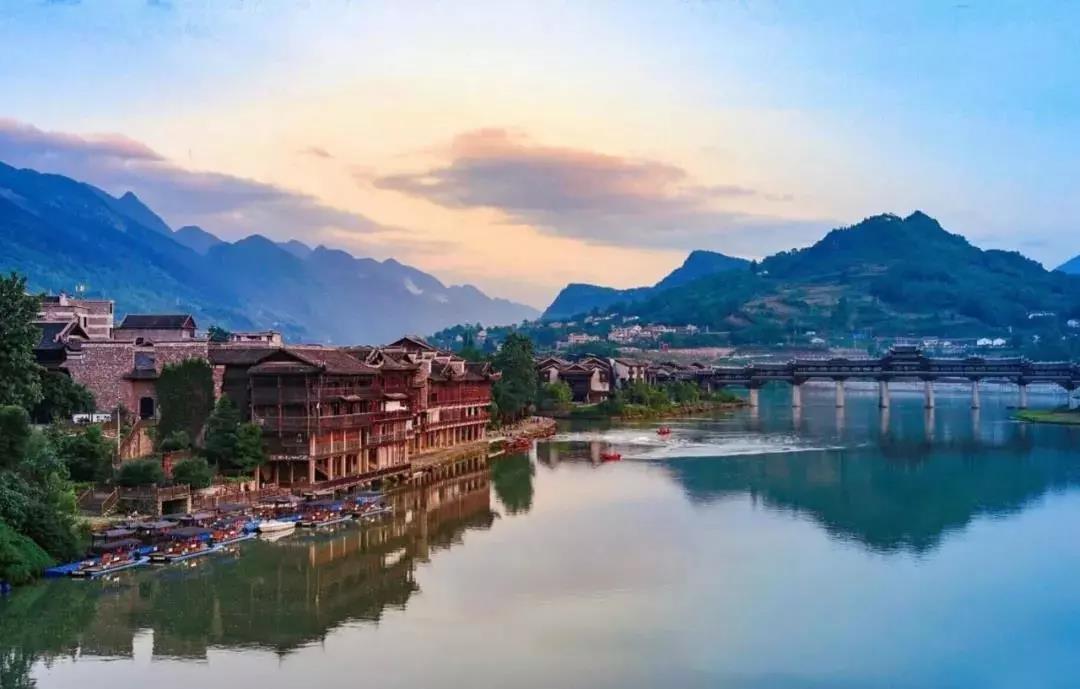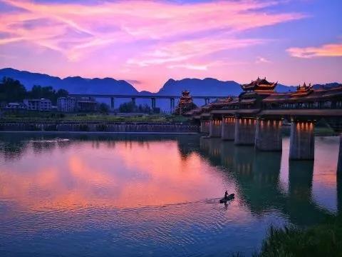 遠眺濯水,世界第一風雨廊橋橫臥江面,雄偉壯觀。遠處青山如黛,斜陽流水,江面的舟舸揚槳收槳之間,就已將這幅自然天成的山水畫卷勾織得和諧熨貼。