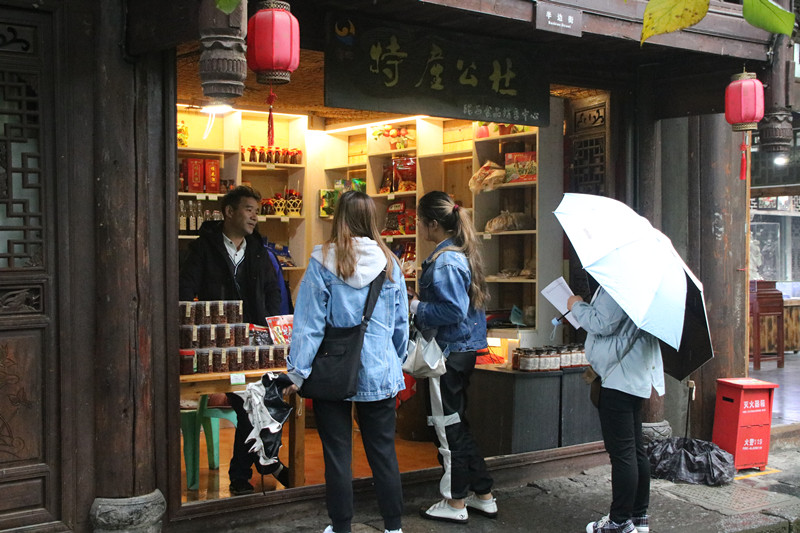 深秋的濯水細雨蒙蒙,但是仍然阻擋不了同學們探尋濯水古鎮的熱情。到達濯水古鎮后,同學們幾人分成一小組,以體味旅游,感知行業為實習任務主題展開活動。