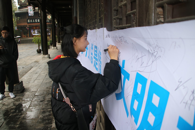 尋找景區不文明旅游現象,發放文明旅游宣傳袋子、尋找20名以上游客在文明旅游承諾倡議書上簽名,達到宣傳文明旅游的目的。