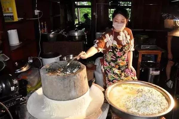 泡:先將上好的大米洗凈,加入一定比例的黃豆和綠豆,在清水中浸泡兩天。待米粒稍稍變軟,然后用大石磨磨成漿。