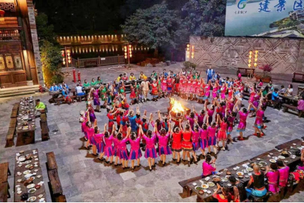 夜幕降臨,白虎廣場燃起熊熊篝火,熱情的土家阿哥阿妹們帶你一起擺手狂歡,歡度激情盛夜!