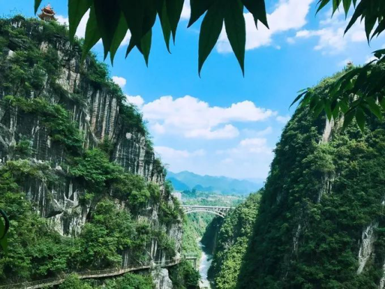 峽谷峭壁直立,崖壁大多與地平線成直角。當你走上808米長的空中棧道,尤其是懸掛在500米高空的透明玻璃棧道,大有“我要飛”的刺激感;