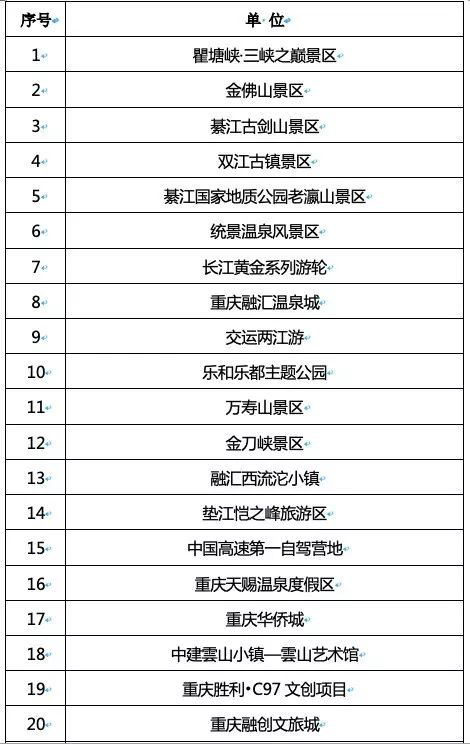 專家們從84個入圍地標名單中認真審核,最終產生文旅新地標40強。以下是第二屆重慶文旅新地標獲獎名單(排名不分先后)。