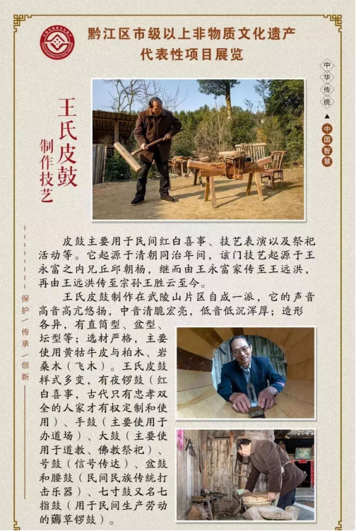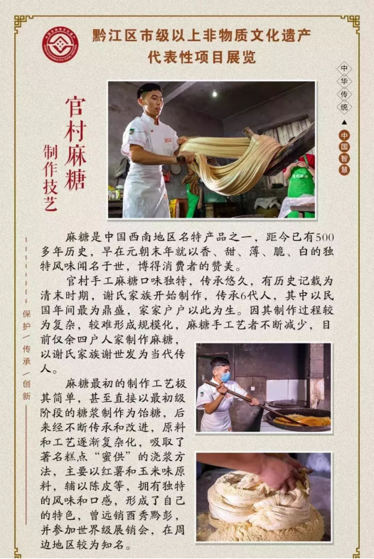 黔江區報送的《白土棕編》《白土嗩吶制作技藝》《土法制香》《黔江區王氏牛皮鼓制作技藝》《王氏灶臺建造技藝》《黔江傳統竹編》《官村麻糖制作技藝》《陸氏中藥酒曲傳統制作技藝》《土家婚俗》《土苗喪葬禮儀》十個項目成功獲批。
