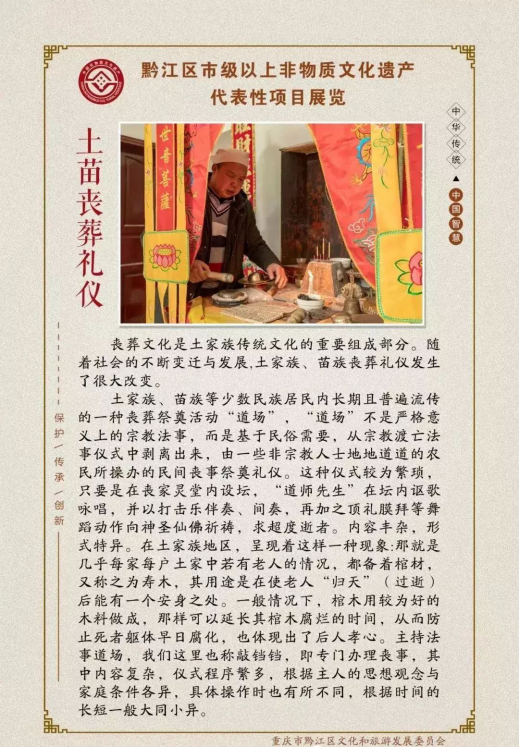 另外,黔江區還把非物質文化遺產與旅游打造相結合。2004年以來,黔江區先后成功申報中國武陵山民族文化節、武陵山國際民俗文化旅游節,建成了土家十三寨民俗生態博物館,承辦了首屆、第二屆和第四屆中國武陵山民族文化節,使之成為了武陵山區重要文化品牌和民族文化、“非遺”傳承的重要平臺。