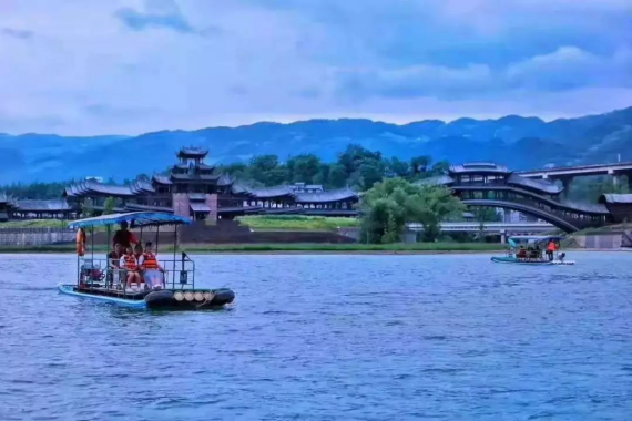 游古鎮(zhèn)老街,品土家美食,看后河古戲,聽蓬江水音。橫跨兩江(河)、氣勢恢宏的濯水風雨廊橋被中國廊橋建筑研究會評為“世界第一風雨廊橋”,全長658米,橋身為純木質(zhì)結(jié)構(gòu),分橋、塔、亭三部分,不釘不卯,充滿濃郁的土家風情,橋身上的憑欄雕刻更是千姿百態(tài),栩栩如生。