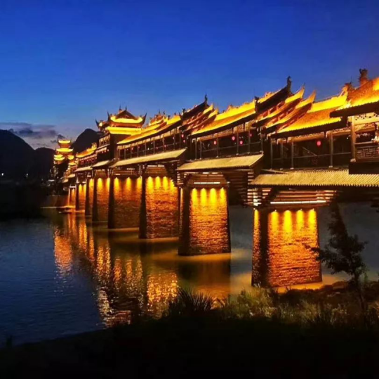 橫跨于阿蓬江上,長658米、寬5米,分為橋、塔、亭三部分,橋身為純木制結構,建筑材料之間以榫頭卯眼互相穿插銜接,直套斜穿,結構牢固精密。是中國西南武陵山區的土家族和苗族建筑藝術的一種。