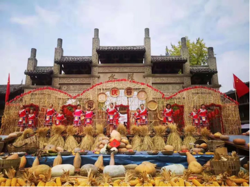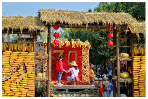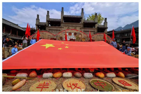 以“喜獲豐收 歡度國慶”為主題重慶黔江獻禮祖國70華誕文化旅游活動在濯水古鎮核心景點內隆重舉行,景區工作人員利用金黃色的玉米、南瓜,大紅的辣椒,以及綠豆、稻草、玉米桿等土地上的實物,增設了豐收喜慶的生活新場景,制作完成了稻草人、“福祿壽喜財”、白虎、玉米簾、蹺蹺板、網紅秋千等景觀,營造出了濃濃的節日氛圍,成為了游客爭相拍照打卡的網紅地標。