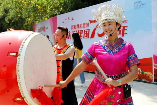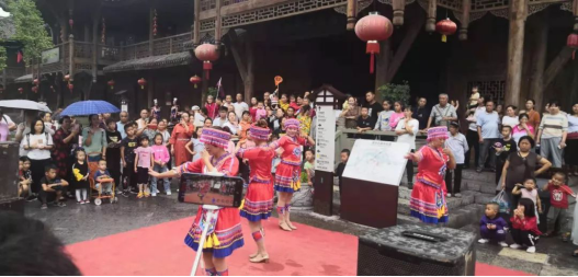 同時,景區還組織了巡游互動活動,向游客推廣普及非物質文化遺產南溪號子、土家山歌等。在濯水景區喝攔門酒、品黔江雞雜、唱土家山歌、跳擺手舞,與毛澤東特型演員互動,重現開國大典盛況,展現了“民族大團結、和睦一家親”的生動場景。