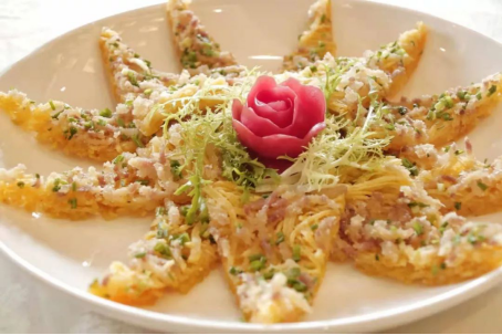 這道菜對洋芋絲的刀法要求極高,需根根勻稱才能烙成,再在洋芋絲里拌少許土家臘肉粒,油炸至兩面金黃,軟糯香脆。