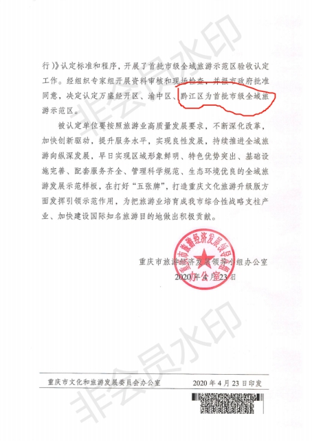 近日,收到重慶市旅游經濟發展領導小組辦公室關于認定首批市級全域旅游示范區的文件,黔江區獲評首批市級全域旅游示范區本次獲批的還有萬盛經開區、渝中區一并入選。