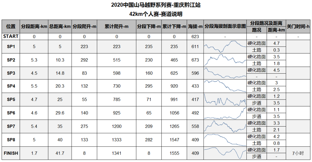 42KM個(gè)人賽總長約41.7km,累計(jì)爬升1341m,累計(jì)下降1550m,最高海拔745m,最低海拔405m,硬化路面約18.3km(43%)。23KM個(gè)人賽總長約23.9km,累計(jì)爬升773m,累計(jì)下降976m,最高海拔745m,最低海拔516m,硬化路面約11.53KM(50%)。群眾健身賽總長約11km,累計(jì)爬升243m,海拔最高點(diǎn)723M, 最低海拔547m,硬化路面4.45km(40%)。