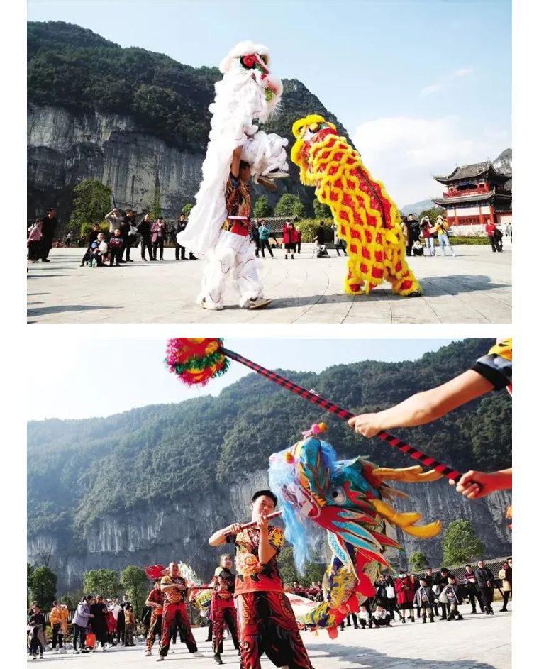 春節(jié)長假期間,黔江城市大峽谷景區(qū)每天進(jìn)行黔江非遺民俗龍獅舞的表演,讓游客在景區(qū)游玩度假的同時(shí),感受土家族民俗文化的魅力。