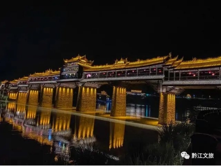 廊橋一共長658米、寬5米,分為橋、塔、亭三部分,是中國西南武陵山區的土家族和苗族建筑藝術的一種,廊橋緊連古鎮,像一弧漂亮的彩虹,臥在阿蓬江上,非常漂亮。