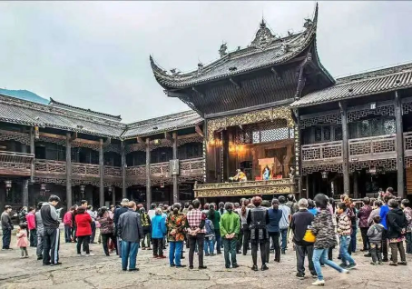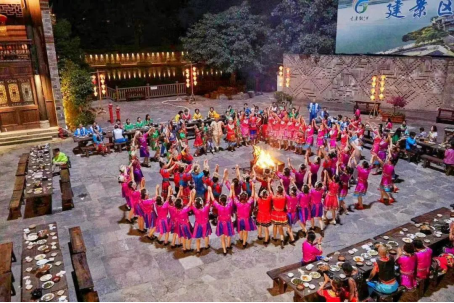 夏天的時候,從周一到周天,只要是天氣晴好的夜晚,在古鎮(zhèn)戲樓前都會舉辦篝火晚會表演。游客們在當?shù)鼐用竦膸ьI下,圍著熊熊篝火,伴著音樂跳起了土家擺手舞,領略土家文化的魅力。