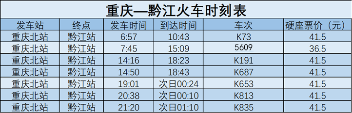 目前全國有多條鐵路線路經(jīng)過黔江火車站經(jīng)停,火車站外包車或出租車前往景區(qū),費用約100元/車,以下是火車班次(僅供參考,火車班次依實際售票為準):